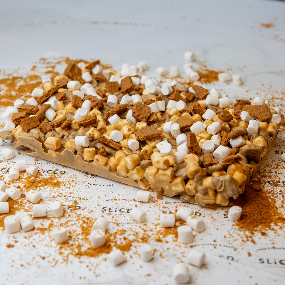 Crunchy biscuit pieces and soft marshmallows mixed with creamy Biscoff chocolate.