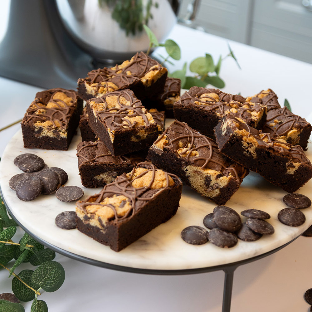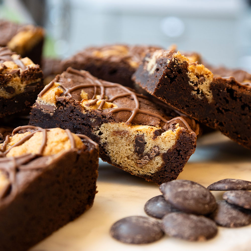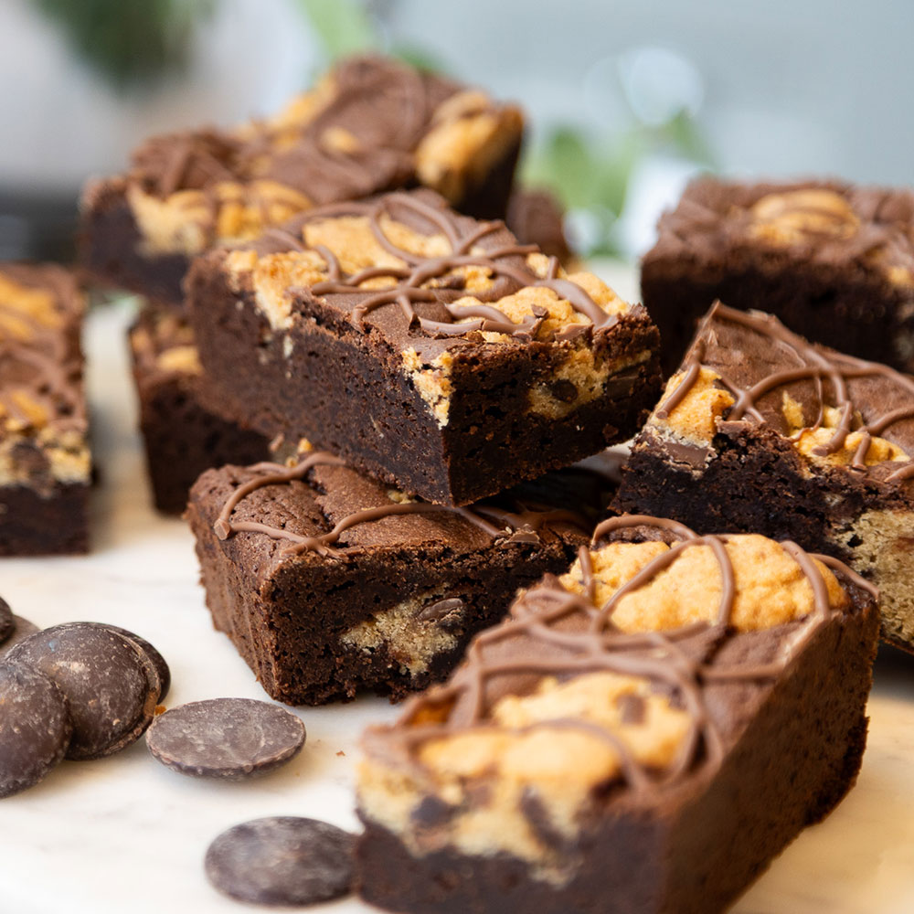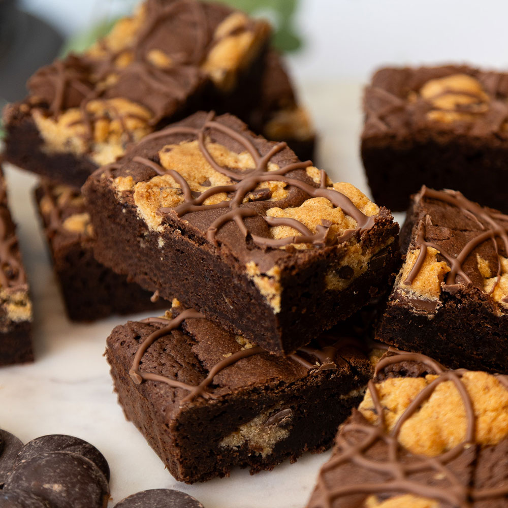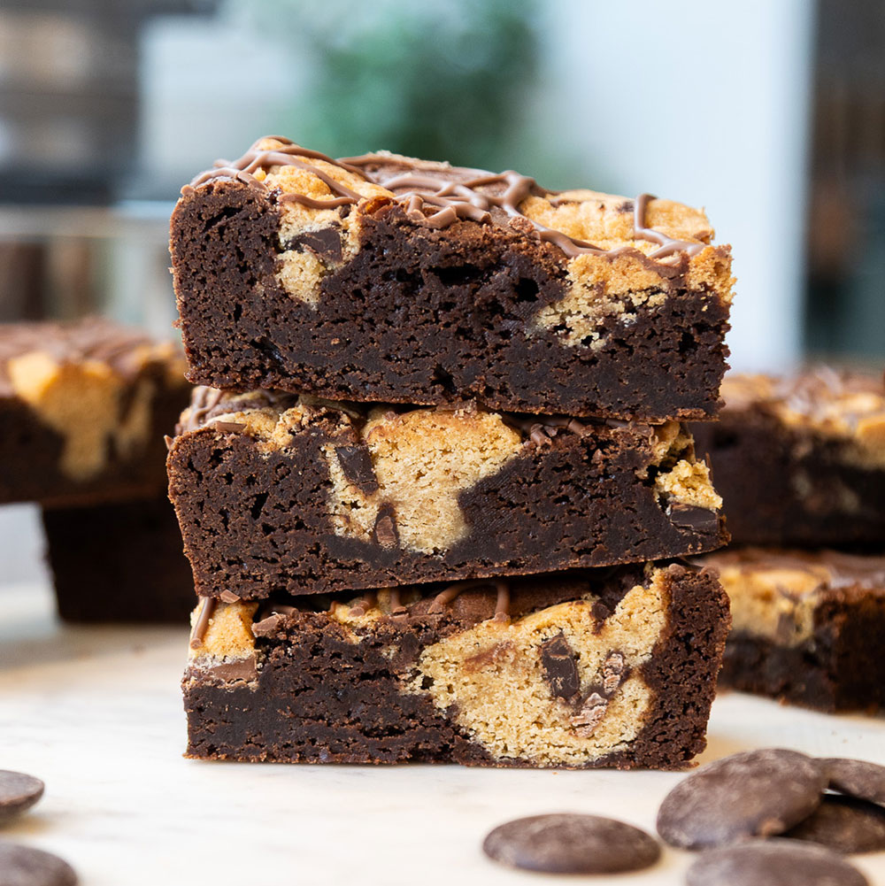 A decadent baked treat featuring a fudgy chocolate brownie base topped with a thick layer of soft, chewy cookie dough, baked together for a perfectly balanced combination of rich cocoa and buttery sweetness.