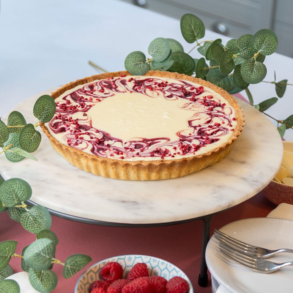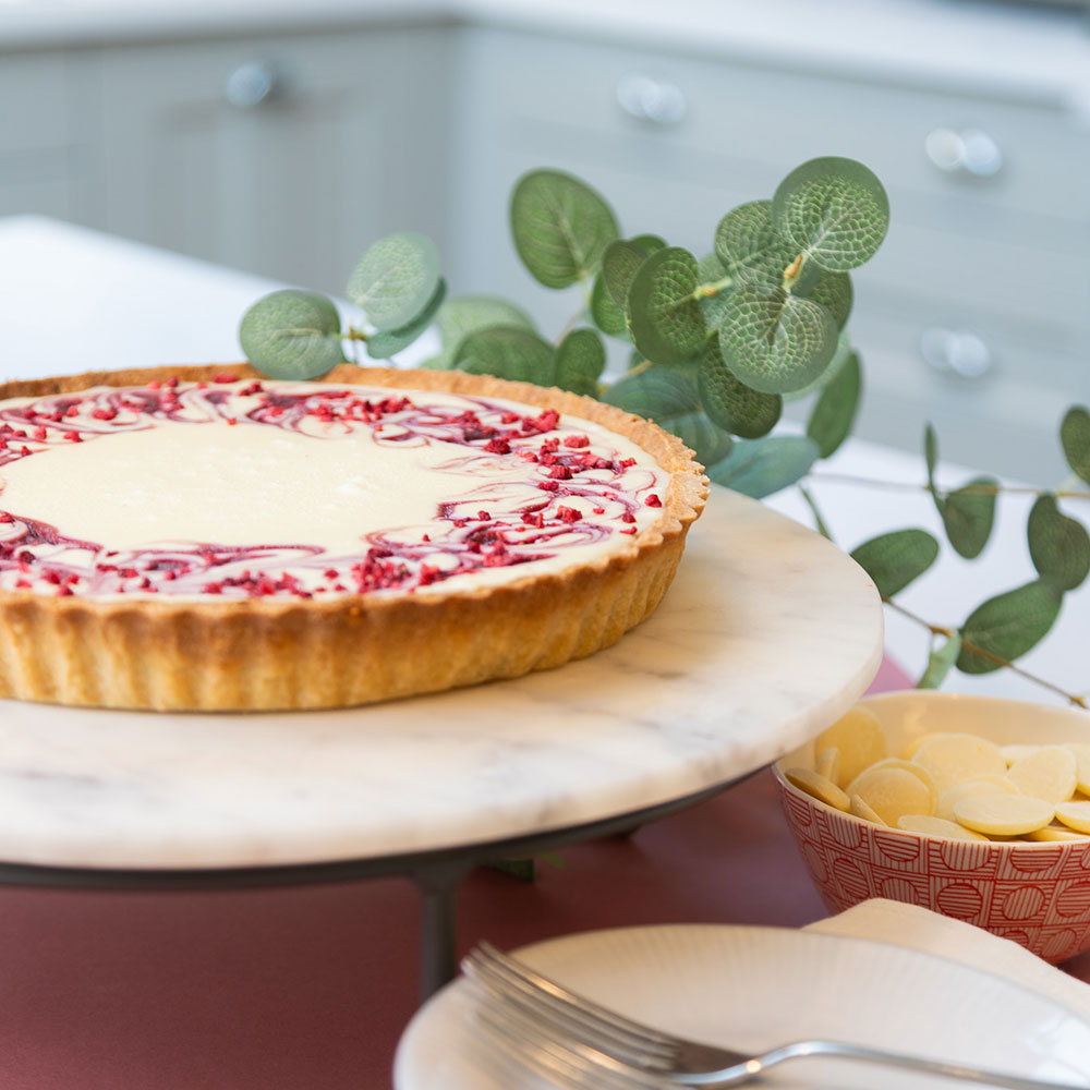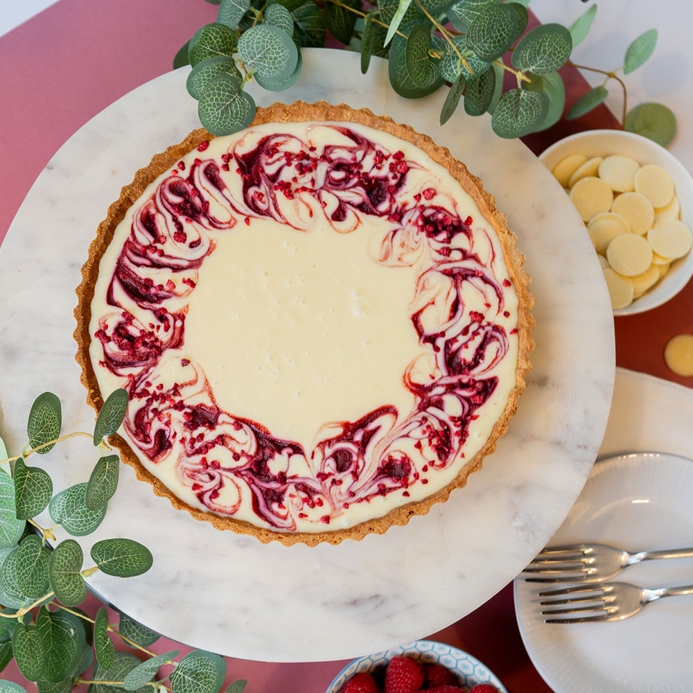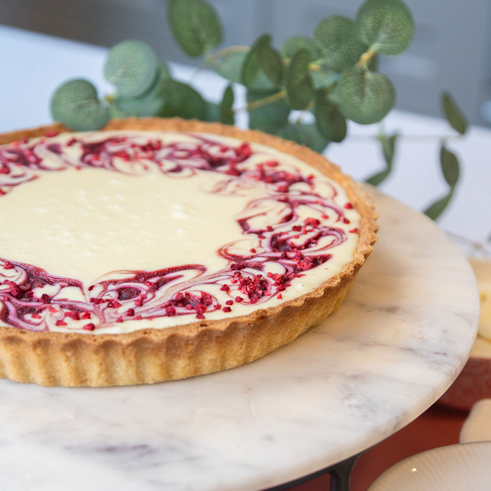 A crisp, buttery pastry filled with a smooth white chocolate ganache and sharp raspberry compote, finished with raspberry decoration.